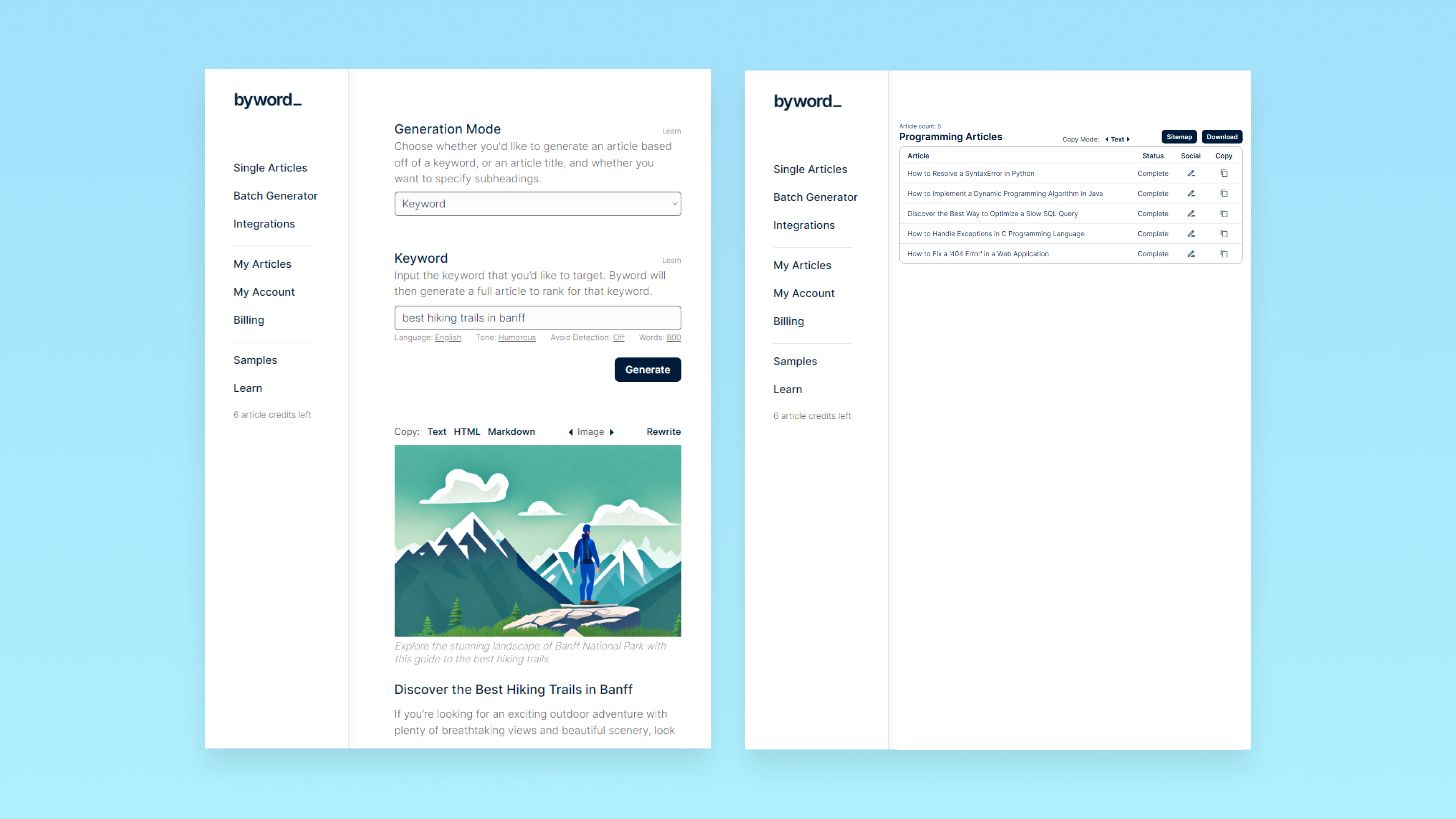 Byword started with a simple landing page. The earliest version let users enter an email address and an article title. Byword would send them a sample article based on the title, and subscribe them to a product waitlist. “It looked very basic,” Mack recalled. “But the core technical problem, ‘Take title, get article’ was kind of solved from there.”
