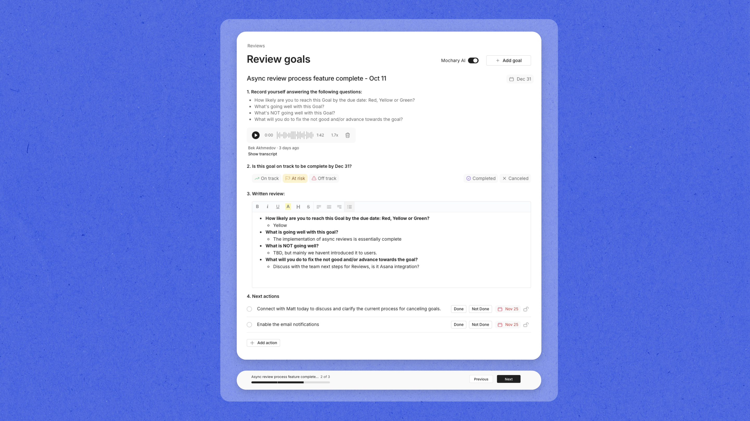 The software prompts users to record pre-meeting updates verbally. The app transcribes these using AI, making them available to everyone to read so meetings are focused, with participants prepared and ready to tackle specific details. Users can also view every participant’s preparation status. During the meeting, users can view and add new content, comment, create action items, and more.